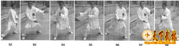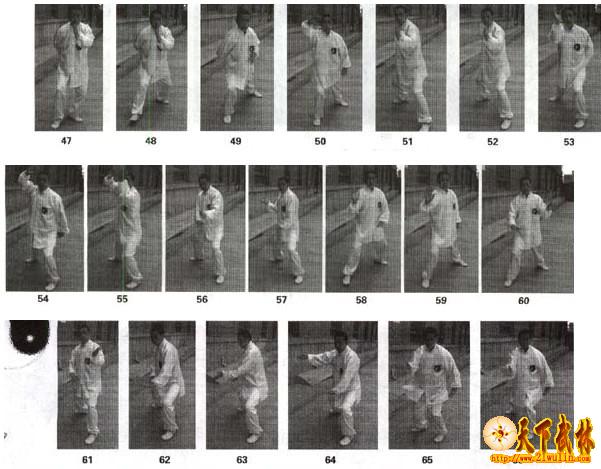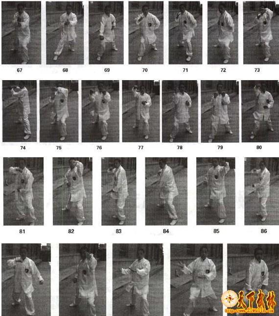 | 陈氏太极拳是各派太极拳的始源。它是由河南温县陈家沟太极拳鼻祖陈王廷所创,历经三百多年的传袭,昌盛不衰,并以其独特的技击与健身功能,广受中外人士青睐。太极拳流派甚多,就陈氏太极拳而言,也有好多套路,有新与老,大与小之分的拳势。随着时代的需求,大师们编了不少新的套路,其中四十二发劲是太极拳大师陈照奎所组编的。这套功夫架的特点为:动作技击明显,适用性强;刚柔相济转换快;圆方突变,慢走柔,快打刚。练此套路必须有一定太极功夫方可学练。 下面介绍四十二发劲拳势动作及练习要求,望太极拳爱好者共同研习之,从习练中更快理解太极之理,增强太极功夫。 第一势:腰拦肘 动作一(图1)立身中正,二目平视,唇轻闭,舌抵上颚,齿轻合,面南背北而站。 动作二(图2)身体缓缓下沉,腿微屈,气下沉,两臂上?,左手逆缠,右手顺缠,沉肩肘,手与眼平,眼视左手中指。 动作三(图3)接上势,重心先在左足,右脚脚跟抬起,划外弧向身后退步。身体向左转,躯干旋转带动手脚,左手顺缠,右手逆缠,双手高捋,重心移至右腿,上下相合,定势塌腰沉气,目视正南方。 动作四(图4)接上势,虚领顶劲,身体向左转,重心移至右腿,成弓步。同时上肢双手相合,如抱球状,左手在外,右手在里,手心相对。沉肩垂肘,含胸塌腰,目视前方。 动作五(图5)接上势,身体向左转。随体右脚外划弧45度上一步,成右虚步。同时,双手相合,互抓手腕,塌腰松胯,劲蓄右腹,意贯右肘,蓄劲待发,目视前方。 动作六(图6)接上势,重心前移至右腿,腰胯向左旋转,蹬左脚助力,弓右膝,沉肩发右肘劲。发劲时裆劲应扣合,意贯肘尖,目视肘前。 第二势:上挑肘 动作一(图7)接上势,身体向右旋转,右脚随体而转,外划弧后退;同时,双手变高捋;前用捋手,后退打背靠。走柔劲,蓄劲待发,目视前方。 动作二(图8)接上势,身体左转,重心移至左腿,由捋势变为右手外划弧顺缠,左手逆缠下划弧落到胸前。虚领顶劲,沉肩垂肘,塌腰落胯,劲蓄右侧,目视前方。 动作三(图9)接上势,重心移至左脚,身体左转。右脚上大步,向前45度落脚,成为右虚步。同时,右手指领劲向耳后穿,左手在右肘下微下按。塌腰松胯,劲蓄右侧,意在肘尖,目视前方。 动作四(图10)接上势,身体迅疾左转,左脚蹬地助力,前弓右膝。同时,右手快速逆缠,向右耳后猛穿,右肘挑打,左手下捋采,上下、内外要相互组合,意贯肘尖,目视前方。 第三势:摘星掌 动作一(图11)接上势,重心不变,右脚踏实扎根。沉肩垂肘,塌腰松胯。右肘要与右膝相合。意在右肘下护胁,蓄动待发,目视前方。 动作二(图12)接上势,重心后移至左脚,身体左转,随塌腰转体,右肘下挂摔掌;同时,双手手心朝下,捋抓猛摔。沉肩松胯相互配合,下肢裆劲合扣,目视右手。 动作三(图13)接上势,重心前移,转换腰胯,体向右转,成右弓步。随转体两手变劲,左手顺缠划弧变前推,右手顺缠变手心朝上,与左手相合,目视前方。 动作四(图14)接上势,重心完全移至右足,屈膝生根,提左膝上顶。同时,上肢双手紧合。含胸塌腰,蓄劲待发,目视前方。 动作五(图15)接上势,左脚踹蹬,重心在右,成左虚步。同时,双手如搓球状,左手逆缠下采,右手逆缠上提,肩沉打肘劲。上下配合,迅速刚发,目视右手。 第四势:穿心肘 动作一(图16)接上势,重心不变。双手握拳逆缠,右手走上弧,左手划下弧,双拳同开。沉肩,塌腰,气沉丹田,目视前方。 动作二(图17)接上势,重心完全放在右足,要扎根站稳。提左脚,膝盖上顶里合,双手顺缠划弧相合于胸前,双手变掌相互抓握于手腕,左手在里,右手在外,目视前方。 动作三(图18)震左脚,同时出右脚,向右侧横跨大步。含胸塌腰,身体微向左转,蓄劲待发,目视右肘。 动力四(图19)接上势,上下相合,身体快速向右侧旋转,蹬左足助力。重心移至右腿,上肢肘尖领劲,左手推送助力,意贯右肘尖,迅发刚劲。 第五势:左背靠 动作一(图20)接上势,重心移至左腿,双手逆缠同开。虚领顶劲,开胸,开裆,塌腰松胯,气沉丹田,目视前方。 动作二(图21)重心完全移至左腿,左足生根成轴心,提右腿,膝盖领劲上顶并里扣,双手顺缠里合在胸前停,左上右下,如抱球状。虚领顶劲,沉肩含胸,塌腰松胯,劲蓄左侧,目视前方。 动作三(图22)接上势,震右脚,重心下沉。同时,开左脚向左侧横跨一大步,双手相合成十字,落于腹前。塌腰松胯,蓄劲于右侧,意贯左肩背,蓄劲待发,目视前方。 动作四(图23)重心快速移至左脚,蹬右脚助力,身体向左侧旋转。双手握拳同开,左拳顺缠外?,右拳逆缠向身后猛击。劲由左后背发出,内外相合,发劲应速,目视前方。 第六势:左? 动作一(图24)接上势,重心不变,身体向左侧微转,松左胯;右手由下划弧顺缠向左?接,与左肩平,手心朝上。虚领顶劲,塌腰松胯,目视前方。 动作二(图25)重心移至右,身体向右旋转。上肢随体变高捋,含胸塌腰;下肢裆应合扣,目视前方。 动作三(图26)重心在右腿,放稳踏实。随塌腰松胯,双手由上向下划弧采按。沉肩垂肘,目视前方。 动作四(图27)重心不变,右手顺缠变手心朝上,与左手照应。腰裆劲要转换过,劲蓄右胯根,意贯掌侧,裆部应圆扣,蓄劲待发。 动作五(图28)重心快速移至左腿,蹬右脚催力,身体向左侧旋转;双手随身体而转,沉肩肘,打?发劲。两手如抱球状,左、右手劲贯小指外侧,目视左手。 第七势:右背靠 动作一(图29)接上势,重心移至右腿,身体向右旋转。双手握拳同开,右上左下划大圆,沉肩开胸,塌腰落胯,气沉丹