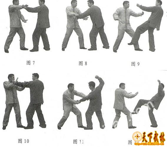 示例2:当敌右拳击来时,我右腕外侧迎敌右臂后,右臂边内旋边以右掌抓扣其右腕,左掌则向右拧拿敌右肘。我右脚向前迈一大步,右掌由外向内缠其右臂,然后右臂上旋竖起并向左后方挂敌右臂,以右掌猛击敌肝肋部位(图4、5、6)。 示例3:敌左拳打来,在我稍向左闪身的同时,右掌由下向上迎左臂,然后右腕边内旋边向右下方缠挂其右臂。待敌重心不稳之际,我左脚上步至敌左脚内侧稍后方,以绊敌左腿,左掌击敌左肋部位把敌摔倒(图7、8、9)。 示例4:敌左拳打来,我以右腕外侧挡其左小臂内侧,左小臂穿敌左肘外侧,两腕同时用力,以顺时针方向拿其左臂左肘,然后我右脚上步,至敌左脚后侧,绊敌左腿的同时,两掌迅速向前整体发力把敌掷出(图10、11、12)。