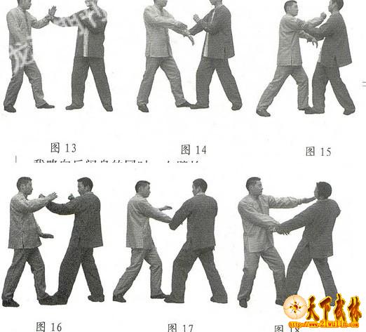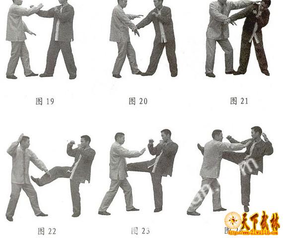 二、白鹤亮翅自卫术 示例:敌用右拳击我头部,我略向后闪身的同时,左臂抬起,以左掌小鱼际部位向下猛砍其右臂,然后左脚向前上半步以踏敌中线部位。右臂外旋,右掌向上向前削砍敌颈,也可以拳钻打敌下颏部位(图13、14、15)。 三、左右搂膝拗步自卫术 在由白鹤亮翅至左右搂膝拗步,的转换过程中,也具有极强的技击作用。 示例1:敌左拳击来,我右臂由下向上抬起,右腕内侧触敌小臂外侧,以阻敌拳锋,然后我右腕绕敌左臂内侧进行逆时针旋挂。紧接着,我以腰部为轴,在上身右转的同时,左掌由下斜向前上方砍敌颈部(图16、1 7、18)。 示例2:敌以右直拳击我头部,我右腕由下向上迎击敌右臂内侧,并以腕部为力点,绕敌小臂外侧。随后,我右腕由上向右下方扣挂其右臂,以完全化解对方进攻之势的同时,左手以掌或拳击打其后脑部位(图19、20、21)。