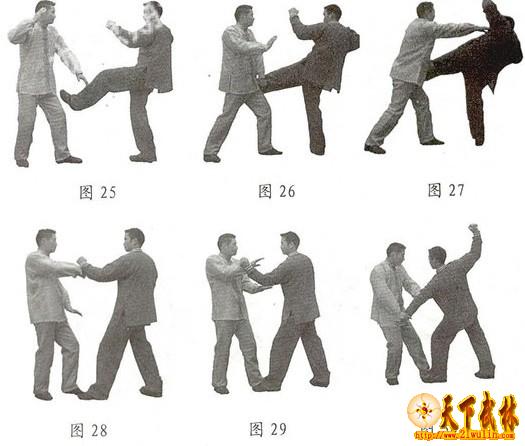 搂膝拗步的自卫应用: 示例1:我下肢左丁八步站立,敌以右脚向我踢来时,我稍向右闪身的同时,左手腕向左搂挂敌右腿。然后,我左脚向前迈半步呈弓步,右手以掌根部位猛推其下颏部位,在敌重心不稳时把其击倒(图22、23、24)。 示例2:敌左腿以侧踹之势向我踢来,我稍向后闪身,左腕向左搂挂其左腿,使其造成失重后仰之势。然后,我左脚向前上半步,整体直向对方逼近,右掌向前击打其左侧耳根部位,也可用指尖戳击其腋窝部位(图25、26、27)。 以上是左式搂膝拗步的应用,右式动作的应用与此相同,唯方向相反。 四、手挥琵琶自卫术 示例1:敌以左拳向我击来,我上身稍向左闪,先以右腕外侧截挡其左小臂,左掌由下向上托其左肘,右腕边内旋边向右下方缠挂其左腕。然后,左腕向上发力,右手拿敌左腕也向上发力,两臂以手挥琵琶式擒敌左臂(图28、29、30)。 示例2:敌右掌抓拉我胸部,我迅速以右手抓其右腕,左掌由下向上推按敌右肘。然后,我于重心下沉的同时,右手向外折拿其右腕,左掌继续按拿其右肘,以形成手挥琵琶式向右下方缠拿其右臂右肘(图31、32、33)。