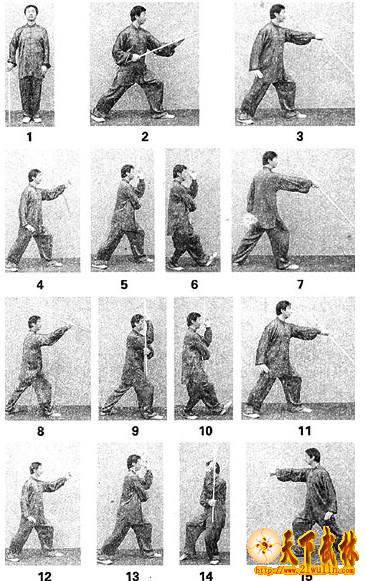 身体左转,同时右手松开,左手向左拉鞭,随即鞭杆左戳,右手变正握把段,目视前方(图25、26)。左脚收并于右脚旁,两腿伸直,同时左手松握鞭上举,右手实握贴于左胸侧,目视前方(图27)。右手握鞭前伸,左手推在右手握鞭处上端,目视前方(图28)。右手松握鞭,在身体右侧向前舞鞭花,鞭梢端住地收式,目视前方(图 29-32)。
