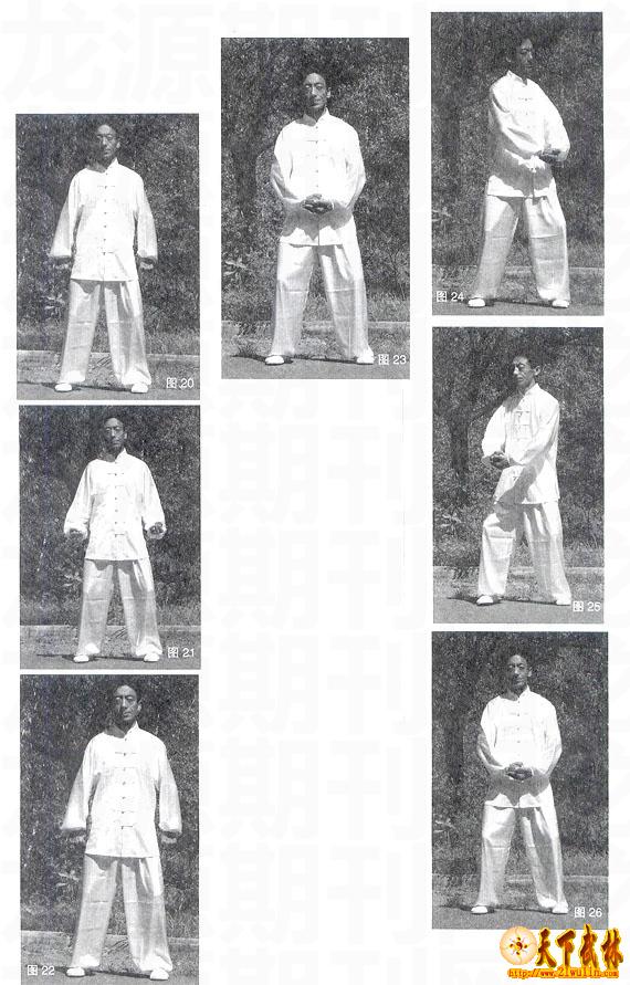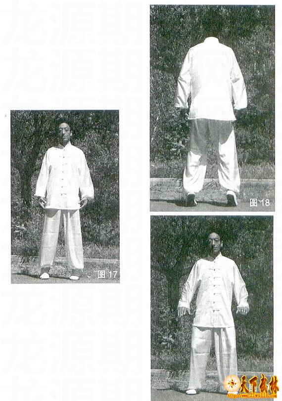 两脚分开与肩同宽,双手交叉于小腹前,开始深吸气,吸气的同时两脚跟向上微微抬起(图17,图18),气吸满后,略停一下,然后瞬间以鼻猛喷气,双手用力下按到腹前,同时口喊“要”字。两脚跟下震着地,全身放松(图19)。