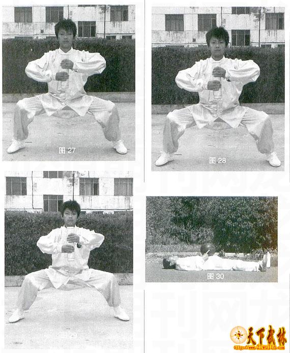 身体转正,重心继续下沉,两脚使劲下踩,两手握拳,拳心相对,平肘与腰间(图32)。