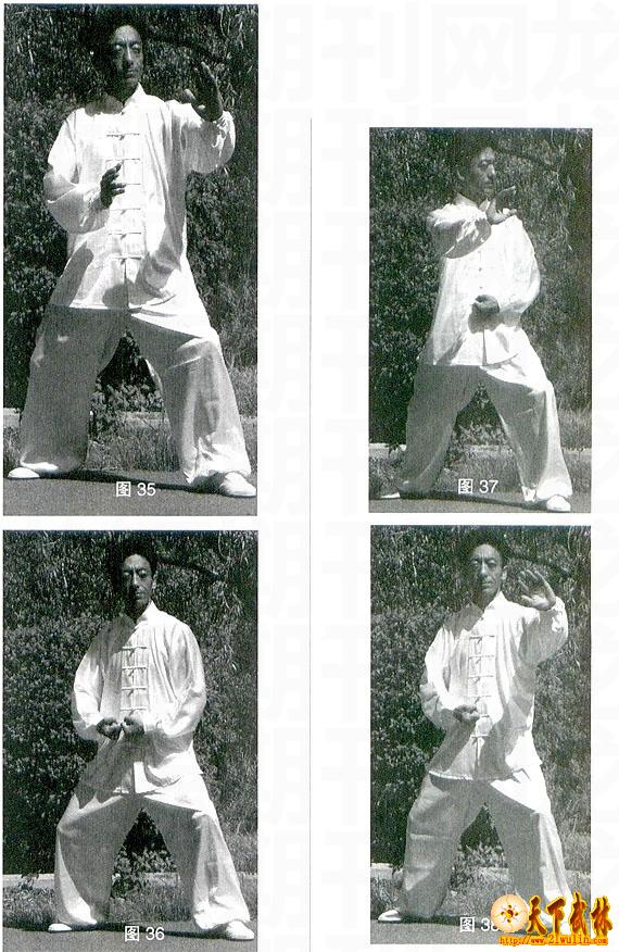 丹田膨胀呼气,胸腰螺旋左转,松左胯,翻右臀,把右手向前发出(图37)。