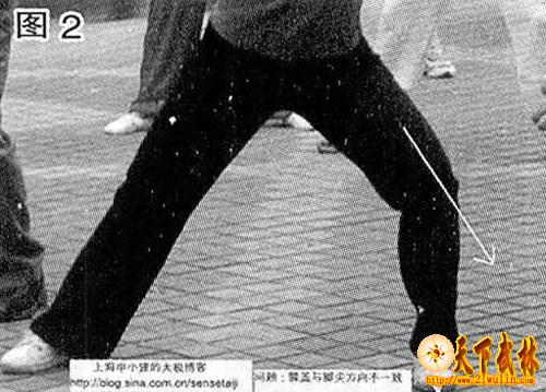 造成此情况的原因主要有以下几点。 一、练拳前热身准备不充分,可能造成膝损伤 科学实践证明,如果不做热身运动而骤然开始练拳,容易造成包括肌腱断裂等损伤。练拳前没有进行充分的热身准备,膝关节周围肌肉韧带还比较僵硬,动作幅度过大一些就易造成膝关节的损伤。 建议:每次都要在训练前做正确充分的热身运动,如做关节活动操或慢跑5~10分钟,以身体发热出汗为佳。膝关节的热身尤为重要,可多做一些。 二、膝关节姿势不正确,是引起膝损伤的主要原因 1?郾膝盖超过脚尖,导致关节受压过度(图1) 练太极拳时身法要求做到立身中正、沉肩坠肘、屈膝松胯,这样原先由髋部承受的一部分体重,此时便因为髋胯的放松而全部由大腿肌肉中的股四头肌(股四头肌具有伸膝作用)承担了,相应地加重了股四头肌的负担。髌韧带因为是股四头肌的肌腱延伸,所以会随着股四头肌的收缩而拉伸,股四头肌收缩越厉害,髌韧带拉伸就越剧烈。根据运动科学中的肌丝滑动原理,肌肉被过度拉长和过度收缩时,肌肉处于最无力状态。膝盖超过脚尖时,膝盖会过度屈曲小于90°,股四头肌(主要是股直肌)因过度拉长而变得无力。此时连接股四头肌的髌韧带也被拉伸过度,由于股四头肌已处于无力状态,上身体重的压力大部分由髌骨韧带承受,当股四头肌猛力收缩时,容易引起髌韧带自胫骨粗隆处撕脱而分离。所以膝盖超过脚尖最容易使髌骨韧带受伤,长期还会导致髌骨软化症(一种劳损症状)。另外身体过度前倾,亦可增加膝关节的压力。 建议:上身务必立身中正,在膝盖弯曲时保持膝盖和踝关节垂直,从侧面看支撑腿的小腿垂直于地面。功力强的练习者可以膝盖稍稍前移至脚背上面,但绝不可超过脚尖。在练拳时,重心要放在脚心和脚后跟的中间位置上,脚掌和脚后跟受力均匀。若感觉脚掌受力超过脚后跟,脚跟又可轻易抬起,则说明膝盖过屈了。对于初学者,一开始务必注意膝关节的姿势,检查支撑腿小腿是否直立、膝盖是否超过脚尖。单腿支撑时脚趾可轻微抓地以增加稳定性,但不要屈膝太多。 2?郾膝盖没有对准脚尖(图2) 在膝盖弯曲的情况下,膝盖过度的内扣和外摆会造成膝关节内或外侧承受压力过大,从而引起膝盖两侧肌肉群失去平衡而导致膝关节副韧带和内外半月板的损伤,也会引起膝盖前部疼痛。陈式太极拳中有许多转脚、转身的动作,有的拳友只转脚而膝盖并不随之转动,或者只转膝不转脚,这时力就会过多地压在支撑腿的膝盖上。如果膝盖先转动、脚尖随后才动的话,这个时间差也会造成膝盖部位横向受力,这也是导致膝盖痛的原因。 建议:无论是定势还是运动中,支撑腿的脚尖和膝盖务必要朝一个方向(髌骨应该和第二个脚趾的方向保持一致),脚尖与膝盖绝不可形成夹角。两膝要有既外撑又内合之意,同时配合胯根撑开撑圆,做到圆裆。太极缠丝桩练习要在圆裆的基础上,两膝一个外摆时另一个则内扣。注意两膝之间的距离在运动中要始终保持一致,万不可忽大忽小,忽大忽小会引起膝盖过度内扣或外摆。