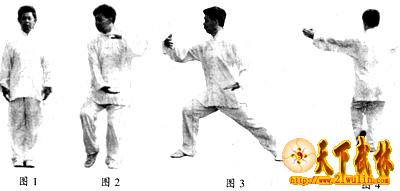 | 八门五步是“太极十三式”的组成部分,有十三种方法,这就是我们平时所讲的棚、捋、挤、按、采、捌,肘、靠,进、退、顾、盼、定。其中前八字是八种手法,后五字是五种步法,俗称八门五步、八卦五行、太极精华和太极十三式,都是指这十三种方法。 八门五步动作名称有起势、棚、捋、挤、按、采、例、肘、靠,前进、后退、左顾、右盼、中定、收势。 起 势: 1、身体自然直立,两脚并拢,头颈端正,肩臂松垂,两手轻贴大腿侧;面向南,目向前平视,心情宁静(图1)。 2、左脚向左轻轻开步,相距右脚与肩同宽,脚尖向前。 3、两手缓慢向前平举至与肩同高时,手心向下,两臂相距同肩宽,肘微下垂。 4、上体保持正直,两腿缓缓屈膝半蹲,两掌轻轻下按,落于腹前,掌与膝相对。 要点:全身放松,舌顶上腭,呼吸自然。 (一)棚 1、右转体的同时,左臂上抬屈于胸前,手心向下;右手翻转向左划弧至左腹前,手心向上,与左手相对如同抱球,重心移至左腿,右腿收于左腿内侧,面向西,目视前方(图2)。 2、右脚向前轻轻迈出一步,脚跟着地,前移成右弓步;同时右臂向前棚出,臂微曲,掌心向内,高与肩平,左掌向左向下落于左胯旁,掌心向下,目视右前臂(图3)。 要点:两手分开要保持弧形,体转要以腰为轴,弓步与分手的速度要一致。 用法:棚,两臂要撑圆,后手五指附在前手腕内,助力外撑。这是主动进攻的招式。 (二)捋 1、上体微右转,右脚向右后退一步,脚前掌轻轻落地。 2、上体继续右转,重心后移到右脚,左脚收于右脚内侧,同时右臂外旋,右掌屈肘提至胸前横掌,掌心向外,左臂内旋,举于身体左侧,高与肩乎,掌心向外,面向北,目视前方(图4)。