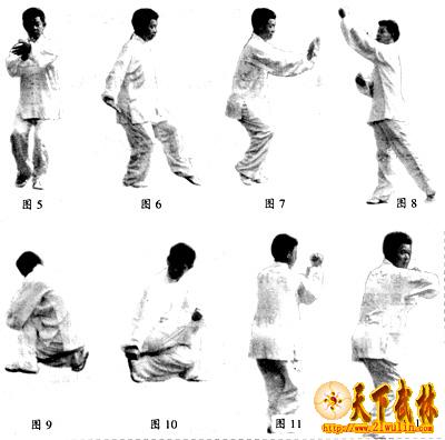 要点:左脚收脚与两臂捋的动作要一致。 用法:捋是破棚的招法,两掌以感觉探知·对方虚实,一手接对方腕,一手附对方肘,顺力捋开对方臂,随捋进招进招。 (三)挤 1、上体左转,左脚向前偏左上步,脚跟落地。 , 2、重心前移,右脚收至左脚内侧后方,脚前掌着地成右丁步;同时左臂屈肘横于胸前,掌心向内,指尖向右;右臂内旋,掌心向外,指尖向上,掌指附于左腕内侧,面向南,目视前方(图5)。 要点:向前挤时,上体要正直,手臂动作与步法一致。 用法:捋开对方棚手之后,遂以挤手进攻,搭手后以手和臂向对方空隙挤按,两手合拢以增加力量。 (四)按 1、上体左转,右脚向后退半步,双手臂向下按掌于身体两侧,双掌掌心向下,手指向前,同时动左脚,成左虚步,面向东,目视前方(图6)。 2、左脚向前上步,脚跟落地,重心前移,右脚收至左脚内侧后方,脚前掌着地,成右丁步;双掌向前推出,掌心向前,目视双掌(图7)。 要点:向前推按掌与上步要一致,两手相距宽度不要超过肩。 用法:按是破挤的招法,下按对方挤来之臂,使对方挤不得力,挤力落空。 (五)采 1、上体右转,面向西南方,重心在右脚,同时,两手臂内旋抓握拳,左手臂伸直,右手臂屈肘在胸前,目视左拳(图8)。 2、重心移向左脚,退右脚,再退左脚成左歇步。同时双手臂由上向下采,目视右拳(图9、10)。 要点:双臂向下采时,腰必须向右转。 用法:用手抓对方臂时,力在十指才能抓实,由上向下采拿。 (六)挒 上体向左转,面向东北方,右脚收至左脚并步,同时右手臂内旋横击,左拳变掌附于右臂,目视右拳(图11)。 要点:转腰、并步与横击一致。 用法:例是取对方全臂,一手抓对方腕,一手横击对方肘,向下捋带。 (七)肘 上体向右转,面向东南方,右脚向右横一大步,左脚收至右脚内侧,成丁步,同时右肘外旋屈臂,左手掌握右拳面,向东南方顶肘,目视肘尖(图12)。 要点:步法与顶肘协调一致。 用法:肘是屈臂以肘尖横击对方。 (八)靠 上体左转,左脚向西北方退一步,成左弓步,同时两手分开,左肩向后靠,右掌向东南方横击,掌心向下,目视右掌(图13)。 要点:退步和肩靠一致,目视右掌,意想左肩。 用法:靠是以肩靠对方胸,或以膀靠对方腰肋部。