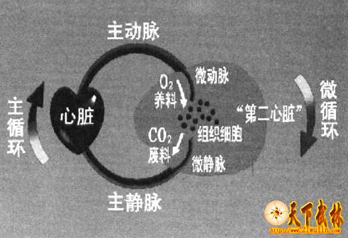 人体是一个复杂又奇妙的机体,我们知道血液遍布全身是从心脏通过舒张、收缩到动脉中去,然后再从静脉回流到心脏,这就叫主循环。可是怎么从动脉过渡到静脉,而又如何使血液将养料和氧气带到每个细胞,并将CO2和废料带出来的呢?这就要说到微循环了。所谓微循环也就是微动脉和微静脉之间微血管中体液(血液、淋巴液、组织液)的循环,它实现着血液和组织细胞间的物质交换,一方面给细胞运送氧气和养料;另一方面排出废物,这也就是人体新陈代谢的内环境,是生命机体最基本的保证,因此被誉为生命的源泉。