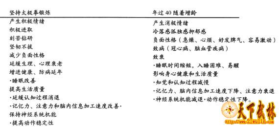 随着增龄记忆和脑内信息加工速度下降,注意力衰退,神经系统机能也逐渐减退,导致动作稳定性下降,试验证明:太极拳对延缓记忆力、注意力的衰退,改善信息加工速度调节运动抑制,提高稳定性有良好影响,起到保持和促进作用。