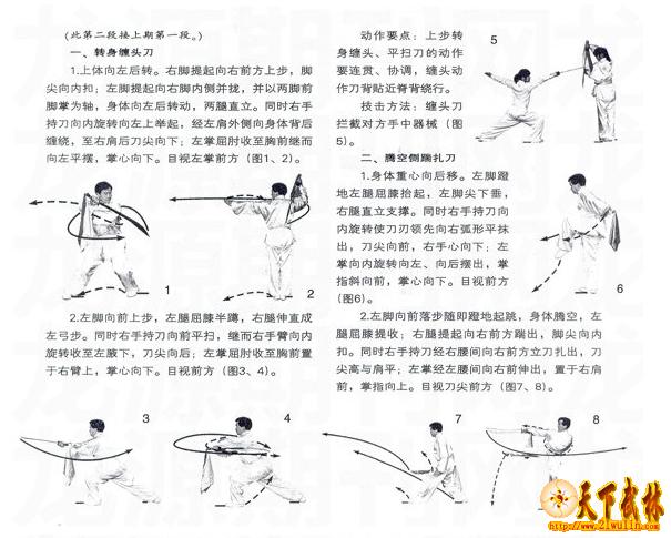 动作要点:上步转身缠头、平扫刀的动作要连贯、协调,缠头动作刀背贴近脊背绕行。