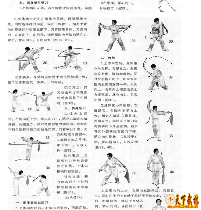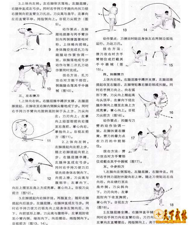 动作要点:刀斩出时刀身与肩臂要成直线,上体挺拔稍向右前倾。