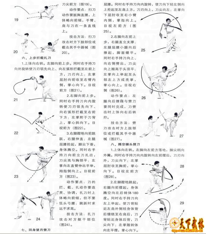 动作要点:扫刀动作要挺胸直腰,上体略向前倾,手臂、肩与刀在一条直线上。