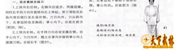 1.上体向右后转。右脚向后退步,两腿屈膝。同时右手持刀向外旋转向左上举起,使刀背贴近右肩向背后绕行至左肩外侧,刀刃向外,刀尖斜向下:左掌屈肘收至胸前,掌心向下。目视左前方(图35、36)。