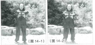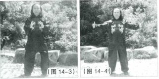 4、开合桩——两脚平行开步,大约与肩同宽全身放松,两臂平行慢慢抬起与肩同高宽,掌心向下(图14-1),上动不停,两腿屈膝半蹲,随即两肘微屈,两手向下按落于胸前(图14-2),上动不停,两手臂外旋,掌心相对于胸前,两掌10-15厘米距离(图14-3),吸气开,不挺胸保持手心相对(图14-4),呼气合,两掌10-15厘米距离,鼻吸鼻呼,目平视正前方,反复练习(同图14-3)。