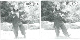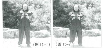 5、虚步桩——两脚平行开步,大约与肩同宽全身放松,两臂平行慢慢抬起与肩同高宽,掌心向下(图15-1),上动不停,两腿屈膝半蹲,随即两肘微屈,两手向下按落于胸前(图15-2),上动不停,重心移向右腿,左脚脚后跟慢慢提起,同时两手臂内旋微开(图15-3)。上动不停,左脚向左前方45度方向上半步,脚跟着地脚尖翅起,膝关节放松,同时两手臂微屈外旋合起,左手指与左脚上下相对指尖高在眼鼻之间,右手掌在左肘内侧掌心与左肘相对,两掌心斜相对指尖斜向上,目平视左手掌方向,左右反复练习(图15-4)。
