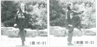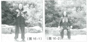 6、平衡桩——两脚平行开步,大约与肩同宽全身放松,两臂平行慢慢抬起与肩同高宽,掌心向下(图16-1),上动不停,两腿屈膝半蹲,随即两肘微屈.两手向下按落于两腿胯外侧(图16-2),上动不停,重心移向右腿,左脚脚后跟慢慢提起,左手带动左腿提膝肘膝相对,左手指指尖高在眼鼻之间,右手按在右腿胯外侧,掌心向下指尖朝前,目平视左手掌方向,左右反复练习(图16-3)。