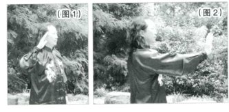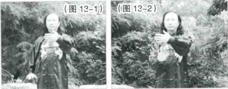 05、拥手——出臂必须呈弧形,手腕与肩膀同高,指尖对鼻尖,沉肩坠肘,后手可下按在体侧,掌心向下,指尖朝前,也可以随前手同时掤出,两臂保持弧形,左右反复练习(图13-1、2)。