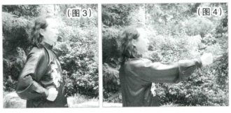 02、冲拳——拳由腰部立拳向前打出,拳高不过肩,低不过胸,力达拳面,左右反复练习(图3、4)。