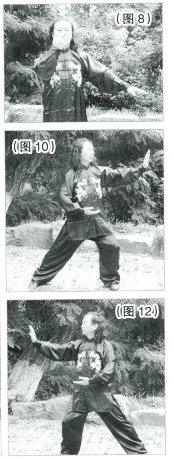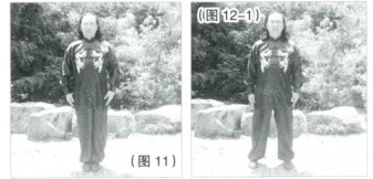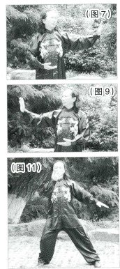04、云手——两手心向内,运转呈立圆,臂不可僵直或屈成三角形,手高不过眉,低不过裆,反复练习(图7、8、9)。熟练后可配合横裆步左右反复练习(图10、11、12)。