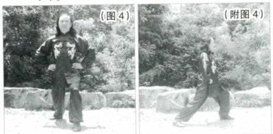 1、弓步——两脚前后开立,前腿屈膝,大腿半蹲,膝与脚尖垂直脚尖稍内扣,后腿伸直,脚尖内扣45度,全脚着地,两个脚间10-20厘米横裆距,左右练习(图4)。