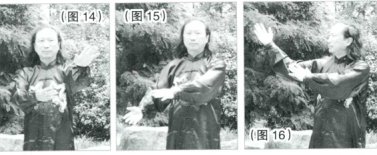 06、捋手——动作必须弧形,前手臂高不过眼掌心向下,后手掌掌心向上合与前手臂肘部(图14),两手臂向下旋转运动,弧形经体侧向后45度捋,左右反复练习(图15、16)。