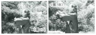 07、挤手——两手臂屈于胸前,内手掌掌心向前,外手掌心向里,内手掌掌心对前手脉门(图17),两臂同时向前挤出,两臂撑圆,前臂高不过口低不过肩,左右反复练习(图18)。