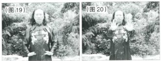 08、按手——两手掌自上而下为下按于腹部,手心斜向下(图19),由下向前弧形推出为前按,手心向前,指尖高不过眼,反复练习(图20)。
