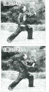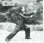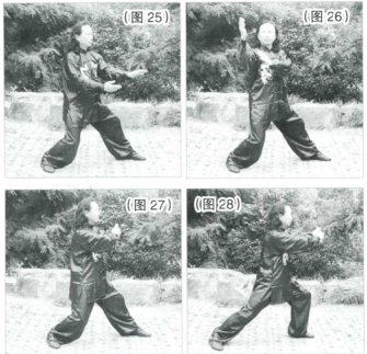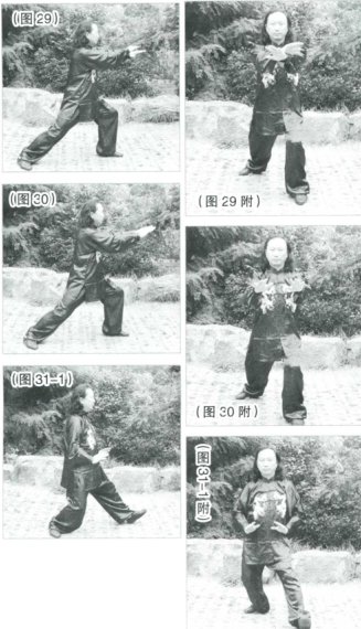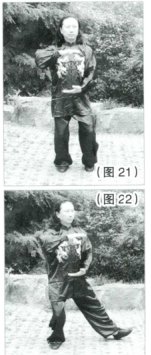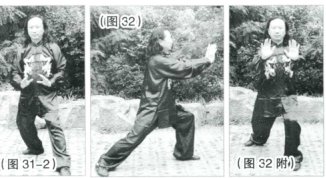 09、揽雀尾——拥捋挤按动作单一练习熟练以后可以结合步型组合练习,组合练习动作在杨式太极拳运动中的名称叫揽雀尾,其练习方法是,拥:两手上下手呈抱球状左手在下右手在上,两臂都要保持弧形,两腿屈膝下蹲,左脚脚后跟提起成丁步(图21)。上动不停,身体微向左转动,左脚向左前方向上步成虚步(图22),同时重心前移成弓步,出左臂弧形拥出,手腕与肩膀同高,指尖对鼻尖,右手可下按在体侧,掌心向下,指尖朝前,也可以随前手同时掤出,两臂保持弧形,(图23-1、2)。上动不停,捋:右手外旋弧线向上,右手掌掌心向上合于左手臂肘部,左手臂内旋,手高不过眼,掌心向下(图24),重心后移成虚步,两手臂向下旋转运动,弧形经体侧向右下后45度方向捋,行至右体侧后45度(图25、26)。上动不停,挤:右手向前向下落,同时身体向左转动两手臂屈于胸前,右手掌掌心向前对左手脉门(图27),重心前移成弓步,同时两臂向前挤出,两臂撑圆,前臂高不过口低不过肩(图28)。上动不停,按:两手掌十字交叉,左手在下右手在上掌心向下(图29),两手掌分开肩高肩宽(图30),同时,重心后移左脚尖勾起(左脚也可以不动)两手掌自上而下弧形下按于腹部,手心斜向下(图31-1、31-2)。上动不停,两手掌自下向前弧形推出前按,手心向前,指尖高不过眼,左右反复练习(图32)。