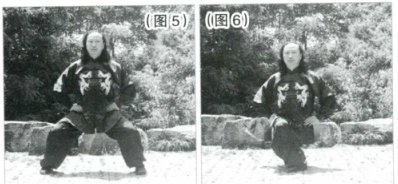 3、歇步——两腿交叉屈膝全蹲,前脚全脚着地,脚尖外摆,后脚脚跟离地,臂部外侧紧贴小腿上,上体正直,左右练习(图6)。