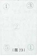 前面介绍了梅花桩(麻将牌的五筒),我们将按照上步、上步、侧行步、退步、退步、侧行步顺序进行练习(图33)。两脚并步站立在右边下方一号位(图34)。右脚外撇45度,两腿屈膝下蹲,左脚向前中间点二号位,上步成虚步(图35-1、35-2),同时重心前移成弓步(图36)。