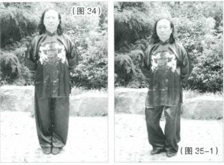 1、无极桩——两脚并步身体直立,悬顶正容、目光平视内敛、鼻吸鼻呼、吊舌提肛、气沉丹田、虚颈收额,沉肩两臂自然下垂,展指舒掌在两胯外侧,不挺胸收腹留臀、膝关节放松脚指微微抓地,心静体松,呼吸平稳细缓深长(图11)。