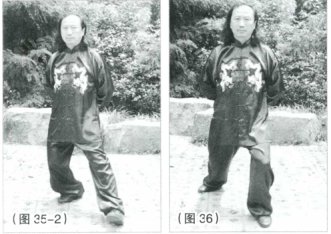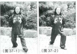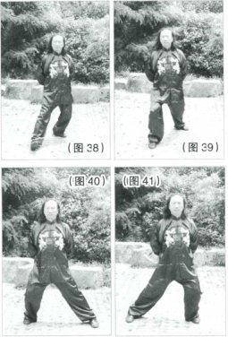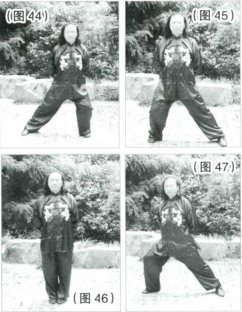 重心后坐勾脚尖,左脚外撇45度重心前移(也可以重心前移直接左脚外撇45度)(图37-1、37-2),同时右脚经过中心左脚二号位,向前右上方三号位,上步成虚步(图38),同时重心前移成弓步(图39)。上动不停,左脚经过右脚三号位,向四号位侧行,脚尖着地然后全脚着地,成横裆步(图40),重心左移成横裆步(图41),上动不停,右脚经过左脚四号位到中间点二号位退步,脚尖着地然后全脚着地,重心后移成虚步左脚尖微内扣(图42),上动不停,左脚经过中间点右脚二号位退步到五号位,脚尖着地然后全脚着地,重心后移成虚步左脚尖内扣(图43),上动不停,右脚经过五号位左脚到一号位,脚尖着地然后全脚着地,成横裆步(图44),重心右移成横裆步(图45),左脚靠右脚并步收势(图46)。这样为完成一次太极五行步。如连续练习可以从(图45)后做右脚外撇45度(图47),接做(图35-2到图45)动作,即左脚经过一号位右脚到中间点二号位,左右反复练习(即将五号位变为一号位先做左脚外撇45度,右脚上步)。在完成动作的过程中除起势和收势站立,其他行进之间应保持高度,不可以或高或低。