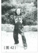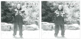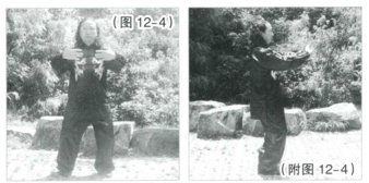 2、太极桩——两脚平行开步,大约与肩同宽全身放松(图12-1),两臂平行慢慢抬起与肩同高宽,掌心向下(图12-2),上动不停,两腿屈膝半蹲,随即两肘微屈,两手向下按落于胸前(图12-3),上动不停,两手臂外旋抱圆,指尖相对,两指间10-15厘米距离,意守丹田,目平视正前方,时间逐步增加(图12-4)。
