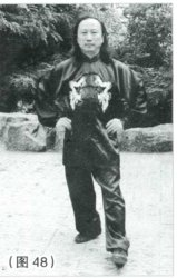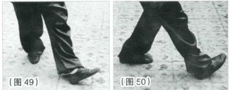 七星(八卦)步主要是根据需要去的方向做脚尖的内扣或外摆(图48)。行进之间,一脚落地脚尖外摆(图49),一脚落地脚尖内扣(图50),做“S”型运动第一步左脚外摆,第二步右脚内扣,第三步左脚外摆,第四步右脚外摆,第五步左脚内扣、第六步右脚外摆为七星步,做“O”(圆圈)运动第一步左脚外摆,第二步右脚内扣,第三步左脚外摆,第四步右脚内扣为八卦步,反复练习。其主要练习方法就是七星步第四步开始变化走“S”型运动线路;八卦步在型第四步时没有变化继续走“O”(圆圈),圆圈大小根据个人自己的步法大小8-10步习练。左右反复练习。