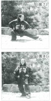 4、仆步——一腿屈膝全蹲,大腿和小腿靠近,臀部接近小腿,全脚着地,膝与脚尖稍外展,另一腿尽量平铺接近地面,全脚着地,脚尖内扣,左右练习(图7)。