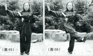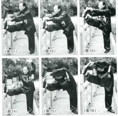 简单的讲压腿就是拉腿部韧带,使我们在做太极拳套路运动动作时动作更加完美。我们这里主要学习的是正压腿和侧压腿;正压腿(图51),要求左腿伸直脚尖向右腿方向,两手抓脚膀臂可以弯曲腿不能弯(图52),根据自己身体情况逐步将腿脚抬高(图53)。侧压腿(图54),要求左腿伸直脚尖向外撇和右腿方向成90度,左手抓右脚侧身膀臂可以弯曲腿不能弯(图55),根据自己身体情况逐步将腿脚抬高(图56)。正压腿和侧压腿后应扶住一固定物体进行正甩腿和侧甩腿(图57、58)。左右反复练习。