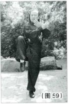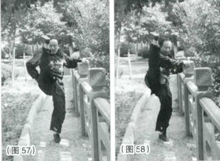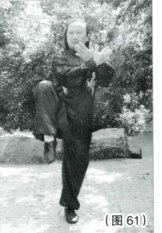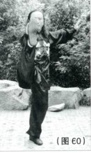 一腿支撑,另一腿屈膝提起脚面绷平,直向前摆起,待高于肩时以同侧或异侧之掌由上向前拍击上摆之脚面作响(图59、60),左右反复练习。中老年学员可以先拍大腿,再拍小腿,有能力了再拍脚。
