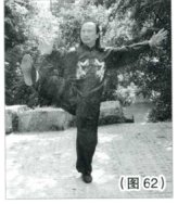 一腿支撑,另一腿屈膝提起,脚面绷平,慢慢向同侧约45度角方向挺膝伸出,脚高不低于腰,两腿伸直,两臂膀配合(图61、62)。左右反复练习。中老年学员可根据自己的实际情况逐步提高脚的高度。