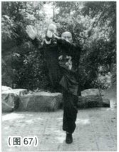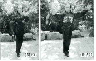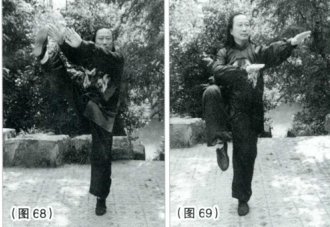一腿支撑,另一腿屈膝提起,脚尖勾起,慢慢向同侧约45度角方向挺膝蹬出,力达脚跟,脚高不低于腰,两腿伸直两臂膀配合(图63、64)。左右反复练习。中老年学员可根据自己的实际情况逐步提高脚的高度。