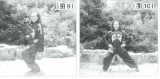 7、横档步——两脚左右分开,大约同弓步距离,全脚着地,两脚尖正对前方,一腿屈膝半蹲,另一腿伸直,左右练习(图10)。