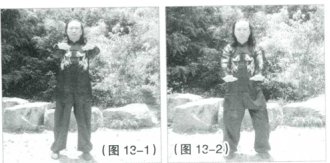 3、升降桩——两脚平行开步,大约与肩同宽全身放松,两臂平行慢慢抬起与肩同高宽,掌心向下(图13-1),上动不停,两腿屈膝半蹲,随即两肘微屈,两手向下按落于腹前,肘膝相对,鼻吸鼻呼,吸升呼降,目平视正前方,反复练习(图13-2)。