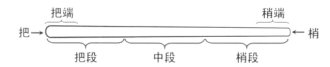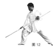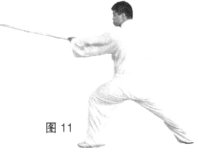 将棍的把端或梢端,从身体的左侧或右侧迅速向前扫出,力达棍的梢端或把端的前端。(图11、12、13)