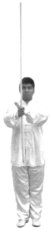 并步站立,右手持棍把段,屈臂置于胸前,棍身直立,棍梢朝上;左手侧立掌掌外侧附于右手手腕处,高于胸齐。(如右图示)