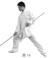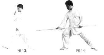 身体微右转,重心后移至左腿,两手握棍向上拨棍,然后重心移至右腿成右弓步。同时两手握棍迅速将棍的把端向下盖打。目视棍的把端。(图13、14)