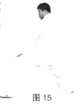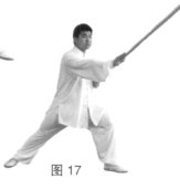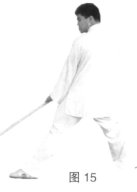 身体右转,右脚后撤步成右弓步。同时两手握棍迅速换把,将棍的梢端由左后经过左膝向前拨出。目视棍的梢端。(图15)