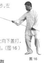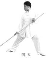 身体左转,右脚上步,左脚跟步成右实左虚步。同时两手握棍迅速换把,左手持棍随势向后划弧;右手持棍将棍的把端由上向下盖打,身体下沉。目视棍的把端。(图16)第十式:孤雁出群与第五式相同,动作相同方向相反。(见图17)