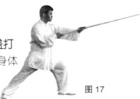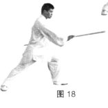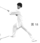 左胯松沉,身体左转,同时两手握棍迅速换把,将棍的把端由上向下打出。(图18)