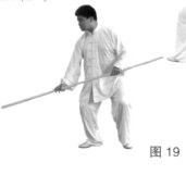 (1)右胯松沉身体右转,重心后移至右腿成右弓步。同时两手握棍,左手持棍随势翻转;右手持棍用棍的把端向下向右拨棍。(图19)