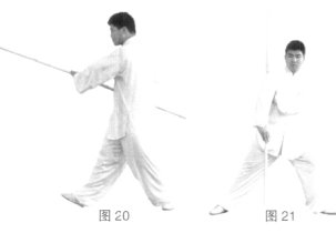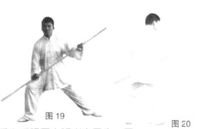 (2)上动不停,上右步,跟左步成右实左虚步。同时两手握棍迅速换把,将棍的把端由上向下打出,身体下沉。目视棍的把端。(图20)第十三式:左右铁扫把