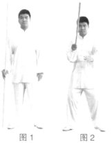 (1)两脚与肩同宽,两腿微曲,身体中正,两臂自然下垂。虚领顶劲,含胸拔背。右手虎口持棍(拇指和食指夹着棍,其他三指搭在棍上)放于右脚脚尖外侧。两眼平视前方。(图1)